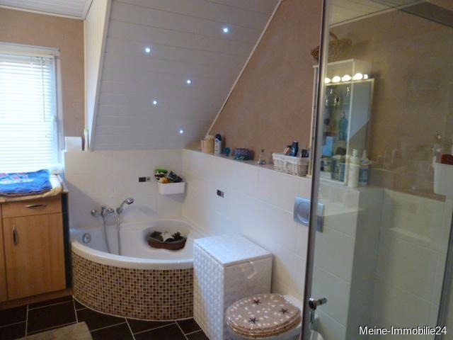 Gäste-WC, Tageslichtbadezimmer mit Eckbadewanne, Dusche, Waschbecken mit Unterschrank und Einbaubeleuchtung im Deckenbereich.
