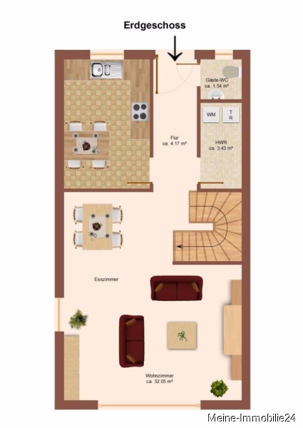 Eingangsbereich mit geräumiger Diele ( 4,86 m² ), Gäste-WC ( 1,54 m² ), Garderobe und ein Hauswirtschaftsraum mit WM-Anschluss ( 3,43 m² ).