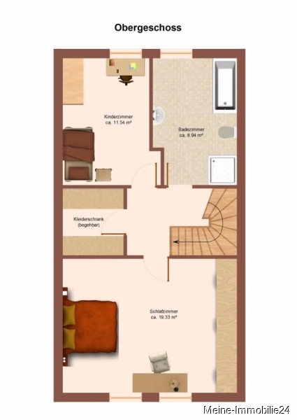 Über die offene Vollholztreppe gelangen Sie in die zweite Wohnebene, auf der sich das moderne Badezimmer mit Eckbadewanne, Dusche mit Echtglasabtrennung, großes Waschbecken mit Unterschrank, WC, ( 8,94 m² ), ein Kinderzimmer ( 13,54 m² ) und das Schlafzimmer ( 19,33 m² ) mit angrenzendem begehbaren Kleiderschrank befinden.