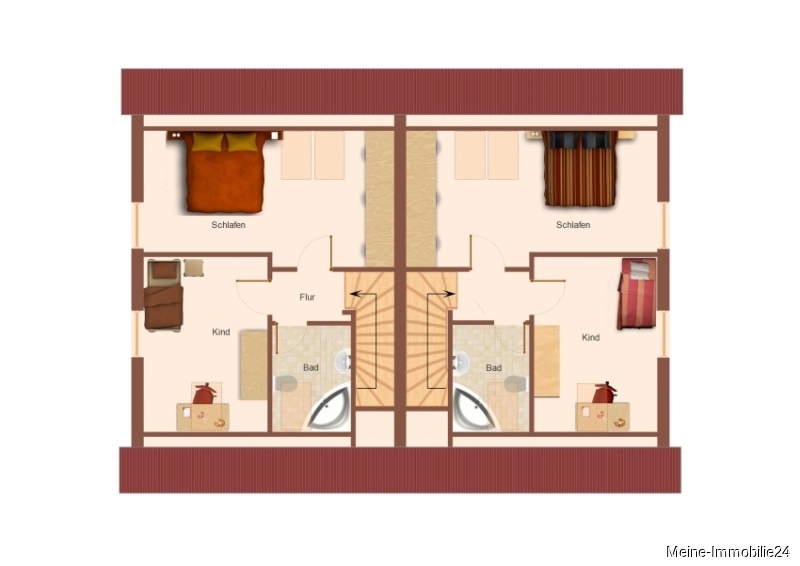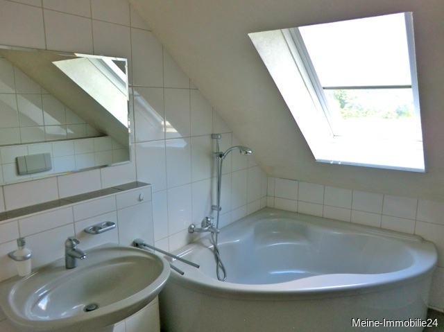 Über die Vollholztreppe gelangen Sie in das Obergeschoss des Hauses, das sich in zwei Schlafräume und einem hellen Badezimmer mit Eckbadewanne aufteilt.