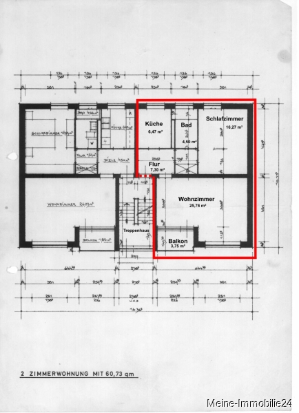 Vom vorderen Flur aus erreichen Sie den Wohn- und Essbereich (25,76 m²) sowie die Küche (6,47 m²). Durch einen weiteren hinteren Flur kommen Sie in das Schlafzimmer (16,27 m²) und das Badezimmer (4,50 m²). Weiterhin verfügt die Wohnung über einen Einbauschrank im hinteren Flurbereich und einen Kellerraum (10 m²).