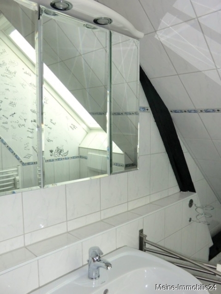 - 1 Badezimmer mit Dusche, Waschbecken, Spiegelschrank, WC, Waschmaschinenanschluß, Fußbodenheizung