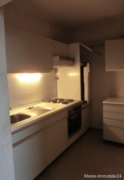 - Küche mit Küchenmöbel, Kühlschrank, Herd/Backofen, Dunstabzugshaube (älter)