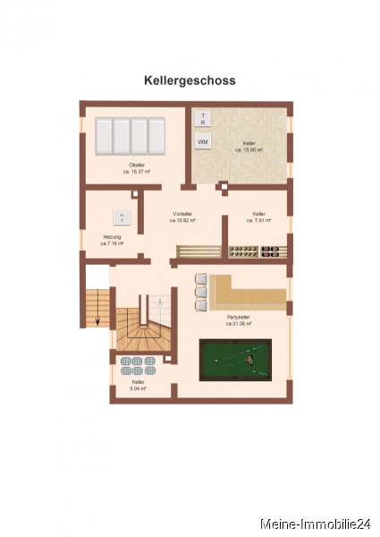 Vollkeller: großer Partyraum mit Ausgang zum Garten, 3 große Kellerräume, Heizungskeller, Ausseneingang