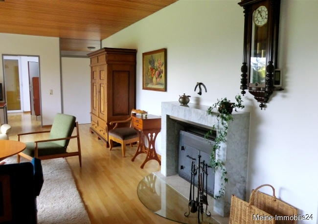 Aus dem Wohnzimmer mit Kamin gelangen Sie über den Freisitz/Loggia/Terrasse in den parkähnlich angelegten Garten in Südausrichtung.