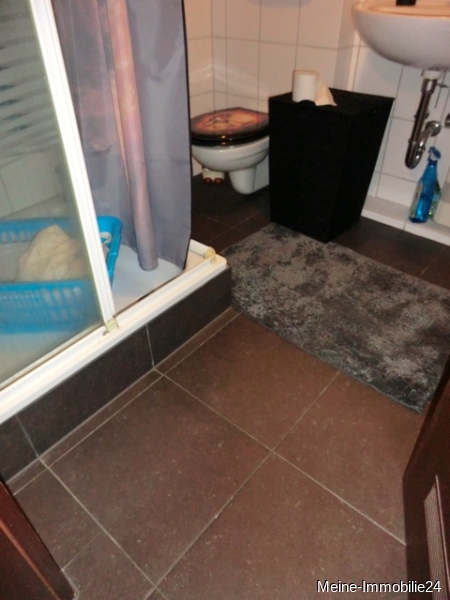 - 1 Badezimmer mit Dusche, Waschbecken und WC, Bodenfliesen - grau, Wandfliese-weiss