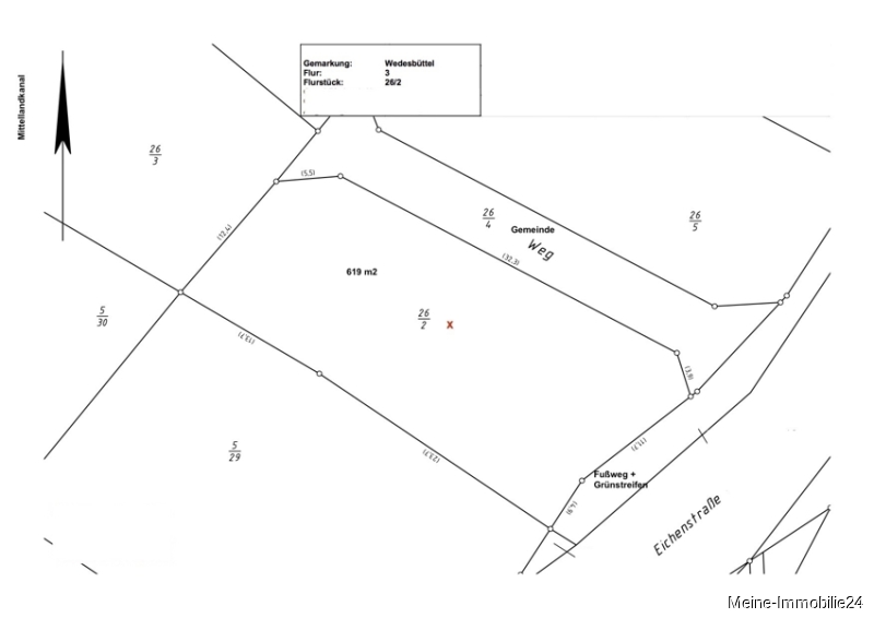 Das Grundstück befindet sich in einem kleinen Neubaugebiet in unmittelbarer Nähe des Mittellandkanals.