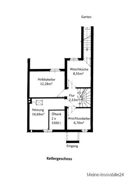 Das Reihenendhaus ist voll unterkellert. Im Keller ist der Heizungsraum (14,69 m²), der Hausanschlussraum (6,70 m²), ein beheizter Hobbyraum (11,91 m²) und die beheizte Waschküche (8,55 m²) mit Zugang zum Garten vorhanden.