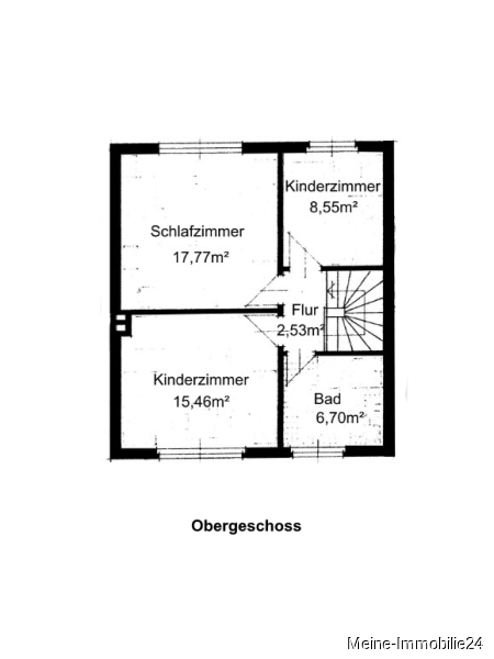 Im Obergeschoss befinden sich 2 größere Schlaf-/ Kinderzimmer (17,77 m² + 15,46 m²) sowie ein weiteres 2. Kinderzimmer (8,55 m²). Das Badezimmer mit 6,70 m² befindet sich auch auf dieser Etage. Flur 2,53 m²