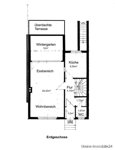 Von dort aus (Erdgeschoss) haben Sie Zugang zum Wohnzimmer (29,22 m²) mit Wintergarten (12 m²), zur Küche (8,55 m²), Garderobe (1,72 m²), Flur und Treppenbereich (5,65 m²) und einem Gäste WC (1,67 m²).