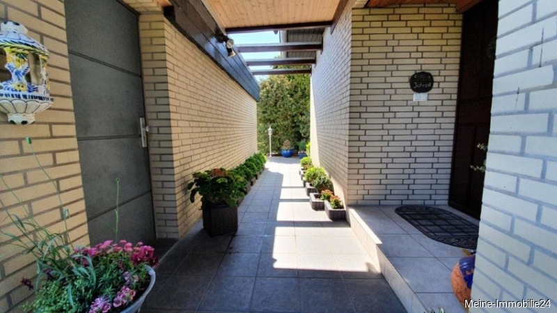Zurückgesetzter und überdachter Eingangsbereich mit Windfang (4,1 m²) und Garderobe.