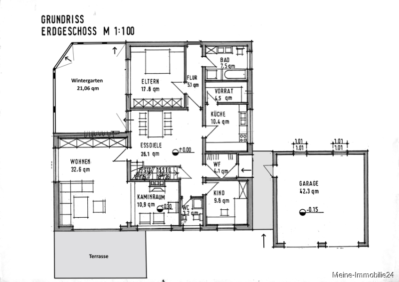Die moderne Küche (10,4 m²), mit hochwertiger Einbauküche, verbleibt im Haus und ist bereits im Kaufpreis enthalten. Im Küchenbereich befindet sich noch ein praktischer Vorratsraum (4,5 m²). Im zentralen Mittelpunkt des Hauses liegt die Essdiele (26,1 m²). Gleich neben der Essdiele geht es in den großzügigen Wohnbereich (32,6 m²) mit dem auf einer anderen Ebene befindlichen Kaminbereich (10,9 m²), dieser ist mit einem offenem Kamin ausgestattet. Auch von der zentralen Essdiele aus kommt man in den schönen und sehr praktischen Wintergarten ( 21,06 m²).