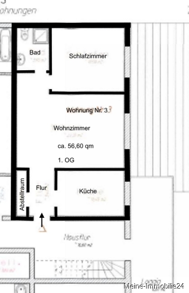 Die 56,60 qm Wohnung liegt im 1. Obergeschoß in einem Wohn- und Geschäftshaus im Zentrum von Meine.