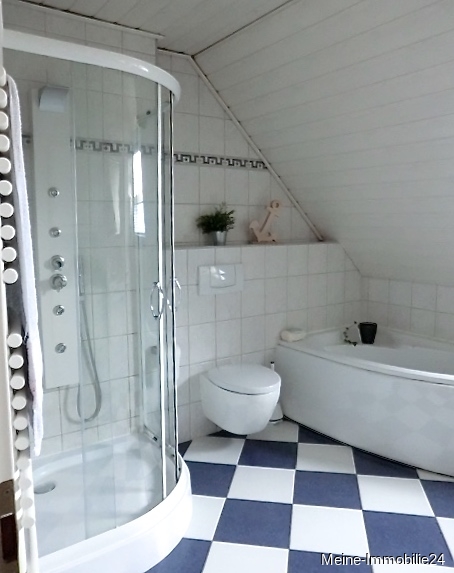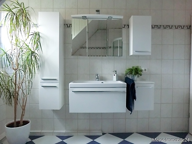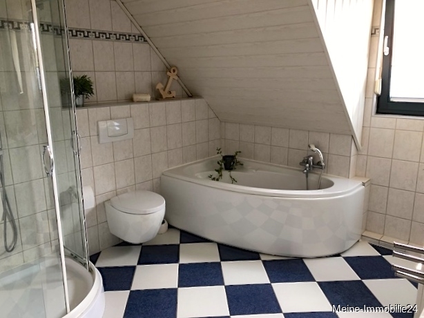 - Badezimmer mit Badmöbeln, Badewanne, Dusche, Waschbecken und WC