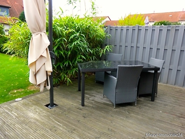 - Terrasse mit Holzdielen und Sonnenschirm