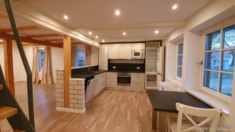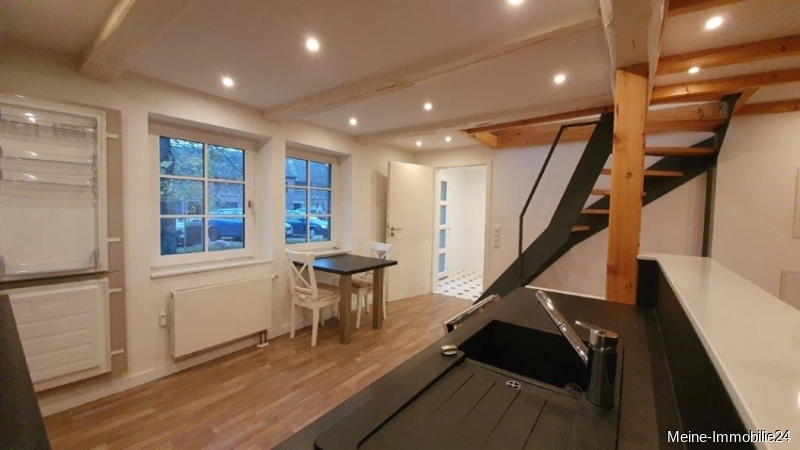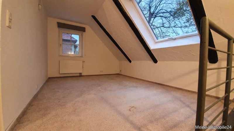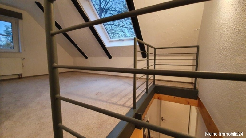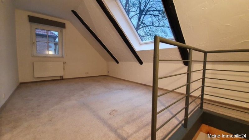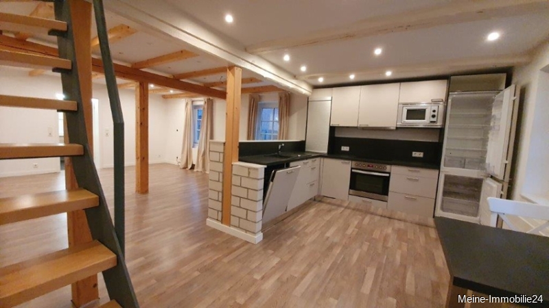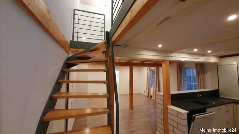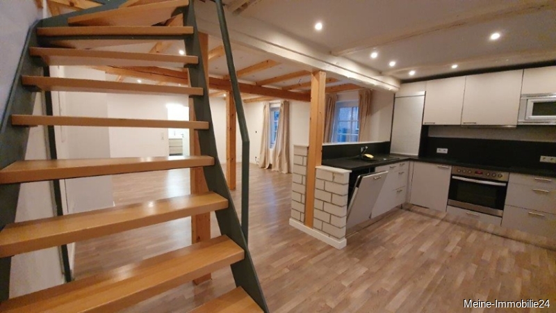 Offene Stahl-/ Holztreppe ins Obergeschoss. Im Obergeschoss befindet sich ein ca. 14 m² großer Schlafbereich mit extra Schrank und Ankleidebereich. Die Fenster im Schlafbereich haben Rollläden. Die Wohnung wurde 2016 neu saniert. Eine neue Einbauküche mit modernen Edelstahl Einbaugeräten wie Mikrowelle, Herd mit Ceranfeld, Backofen, Geschirrspülmaschine, Kühl- / Gefrierkombination sind vorhanden. Elektronische LED Deckeneinbauleuchten im gesamten Wohnbereich schaffen einen modernes Bild der Wohnung.