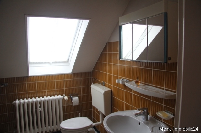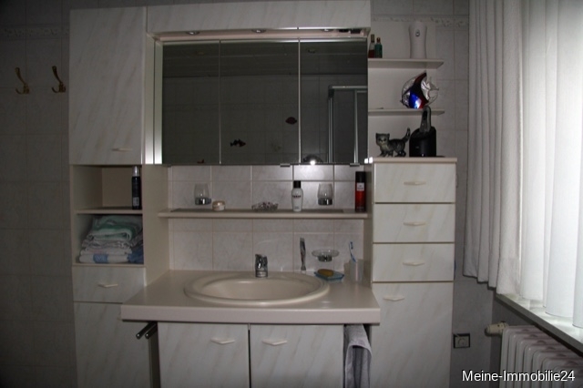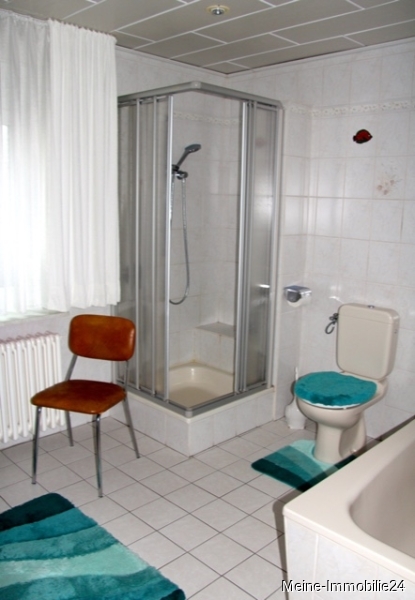 - Badezimmer von ca. 1995 mit Badewanne, Dusche, Waschbecken und WC