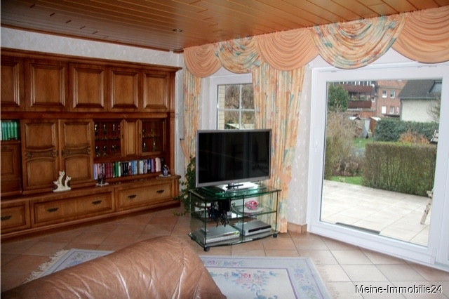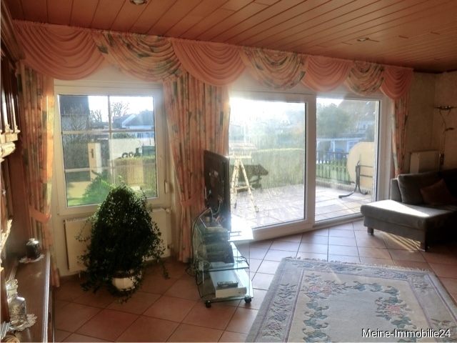 - Wohnzimmer in Südausrichtung mit Zugang auf die geflieste Terrasse und Garten ( Schiebeanlage in Kunststoff weiss von 2019 )