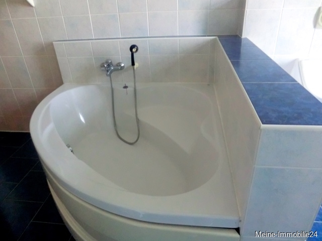 - 1 Badezimmer mit Fliesen, Eckbadewanne, Dusche, Waschbecken und Spiegel, WC