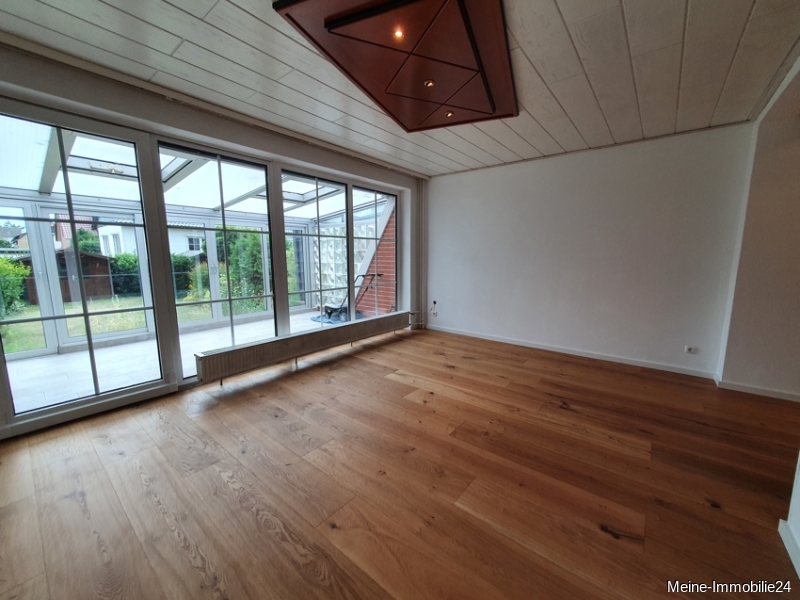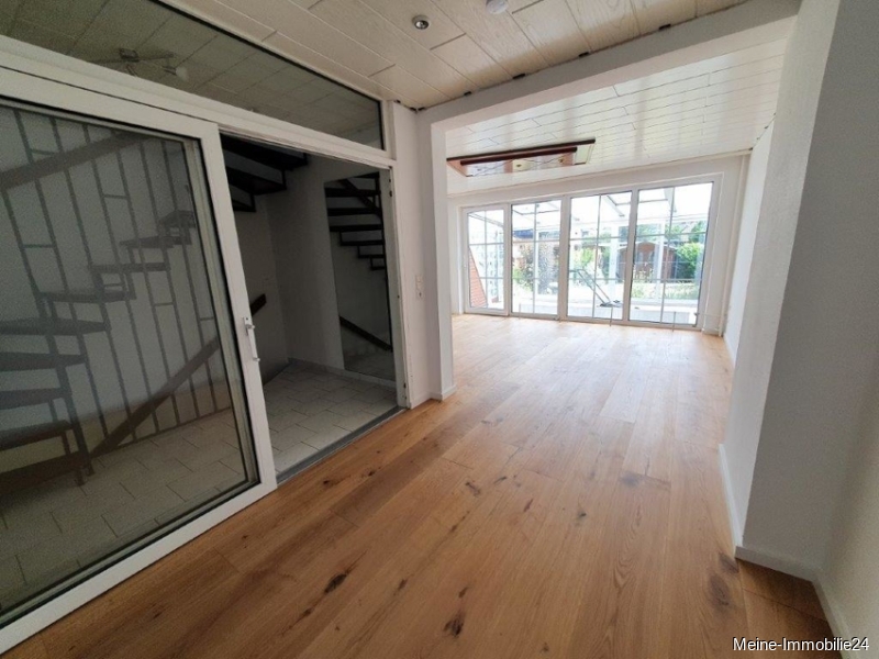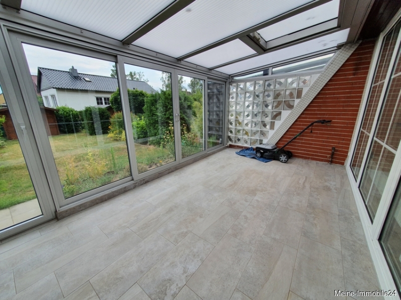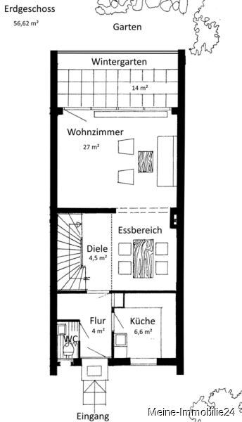 Im Erdgeschoss befinden sich ein Wohnzimmer mit 27 m² mit dem besonderen Highlight eines 14 m² großen Wintergartens, sowie eine Küche 6,6 m², ein Gäste WC 1 m², und der Flur und Treppenbereich 8,5 m² mit Einbauschrank.