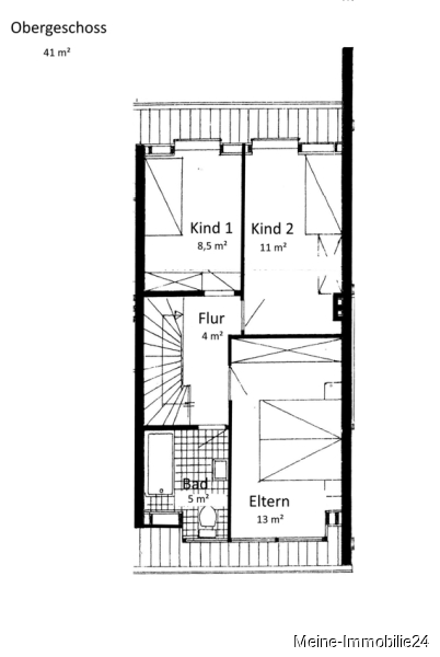- OG 41 m² Wohnfläche mit Kinderzimmer 1, Kinderzimmer 2, Schlafzimmer, Bad, Flur, Treppe