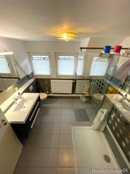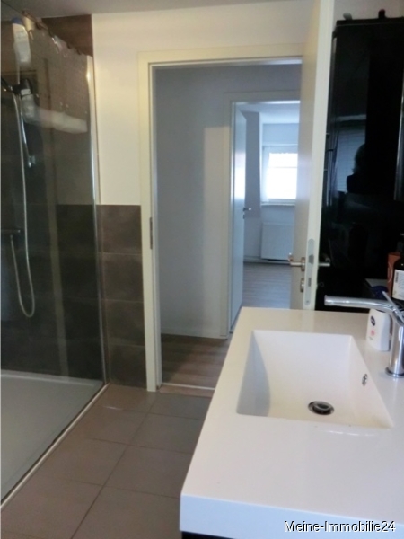 - Badezimmer mit großer ebenerdiger Dusche, Waschtisch, WC aus 2016, mit Gaube