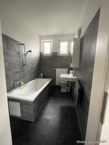 - Badezimmer mit Wanne, Waschbecken und WC, modernen Fliesen aus 2016
