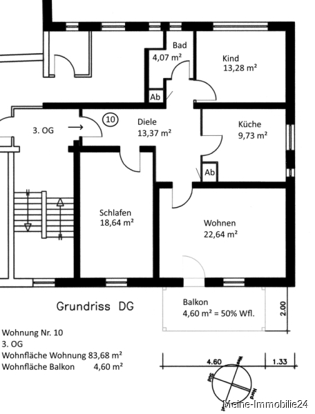 - Balkon 4,60 m x 2,00 m (zur Paulikirche) = 9,20 m² = 50% - (4,60 m² Wfl.)